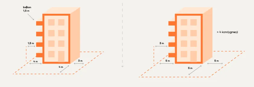 - Minimalna odległość dla ściany z oknami lub drzwiami wynosi 4 metry, a dla ściany bez otworów – 3 metry.