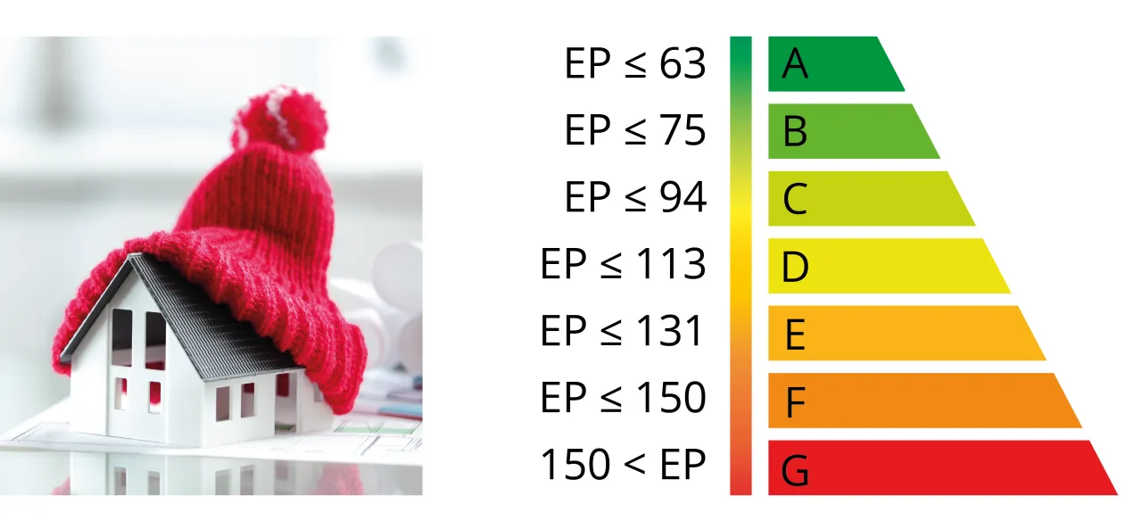 - Wskaźnik energii pierwotnej (EP) jest prezentowany na suwaku energetycznym, co ułatwia jego interpretację.